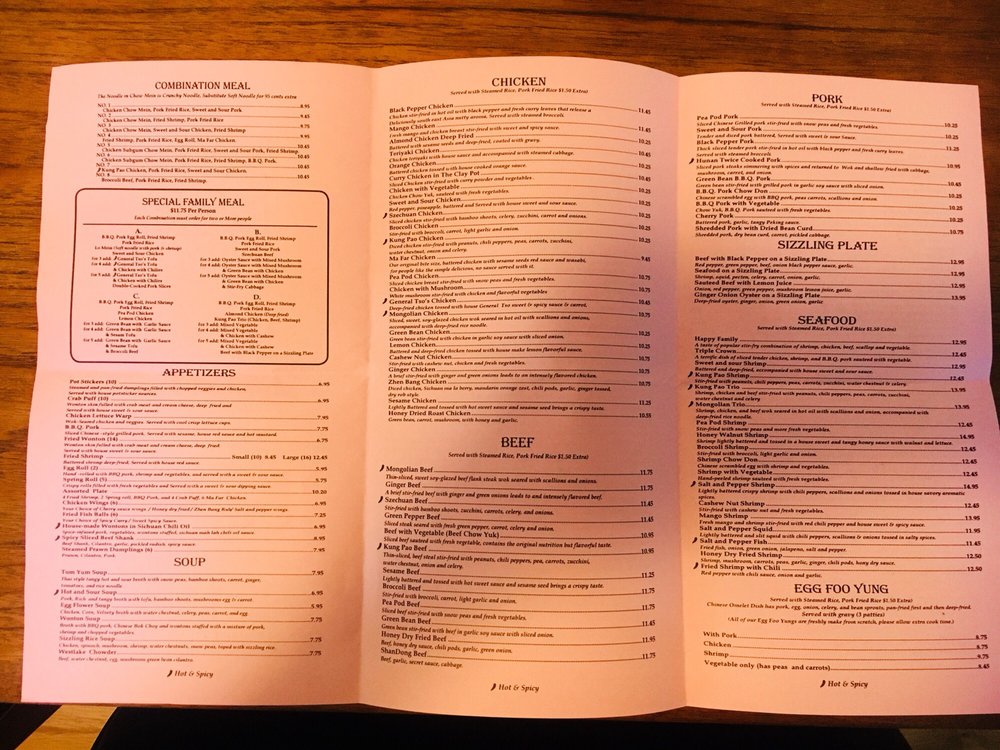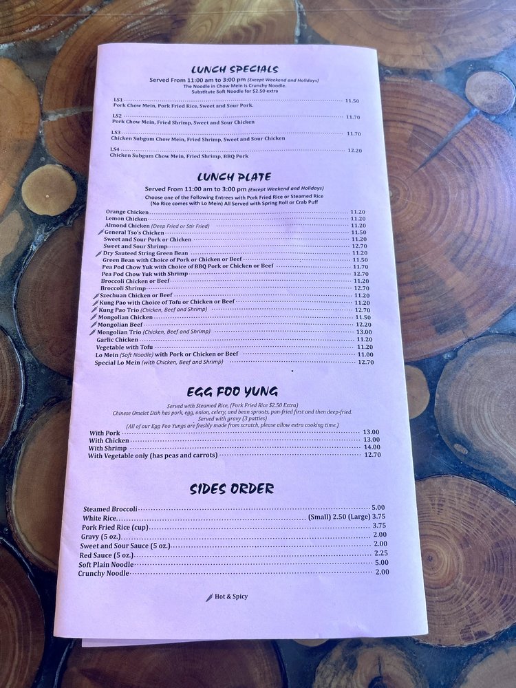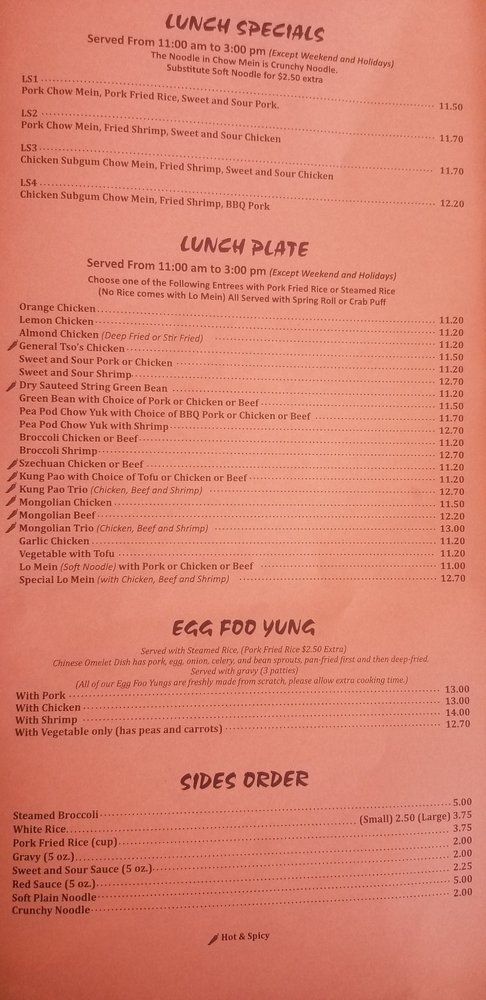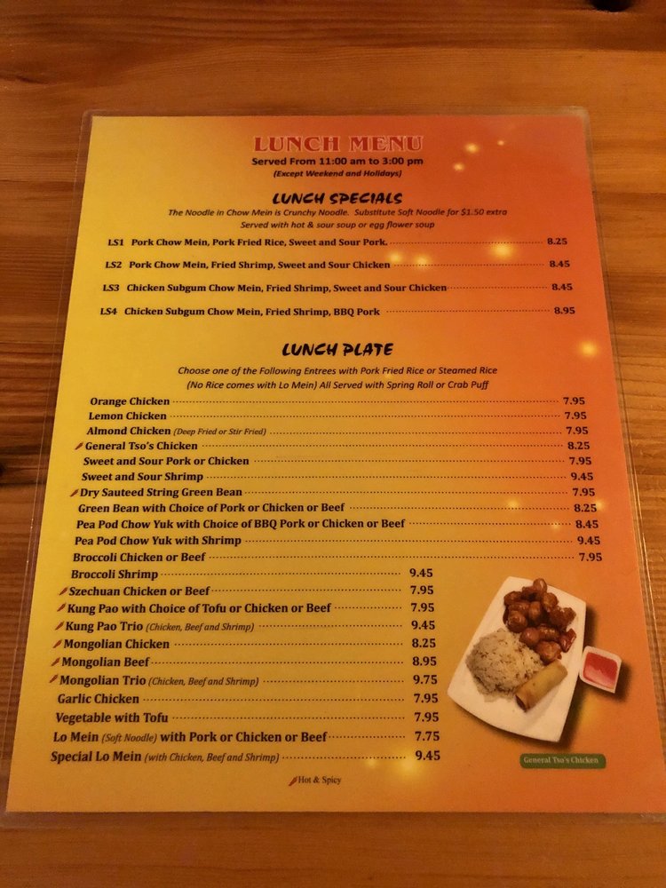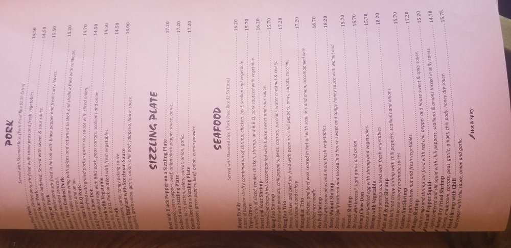 Chicken, chow mein, pork fried rice, sweet and sour pork.