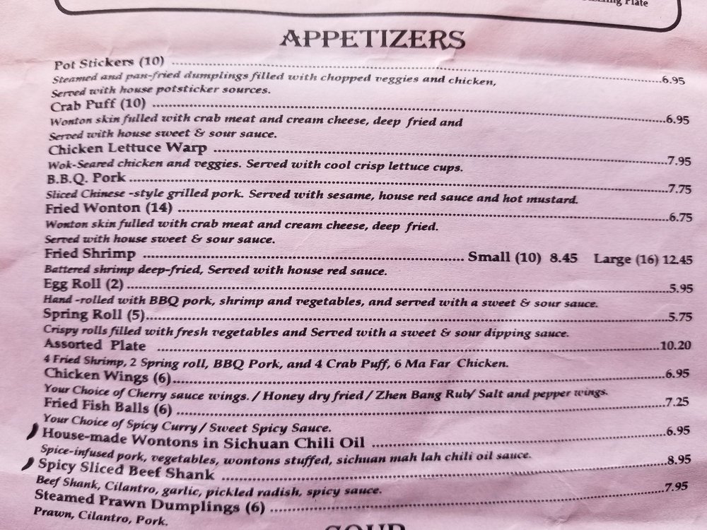 fried shrimp, spring roll, BBQ pork, Crad puff, ma far chicken.